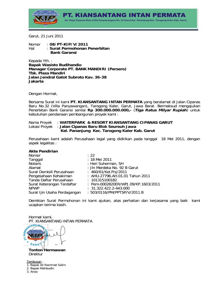 Contoh Surat Permohonan Bank Garansi Mandiri. Hotel Aryaduta Bandung Jl. Surat IMB agunan Surat keterangan lainnya 2.